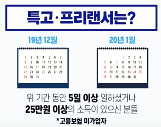 이 중에서도 2019년 연소득 5,000만원 이하 / 2019년 12월 ~ 2020년 1월까지 10일 이상 인력을 제공하고 50만원 이상 소득이 발생한 고용 미가입자 라는 조건도 충족하여야만 지급 받을 수 있습니다.